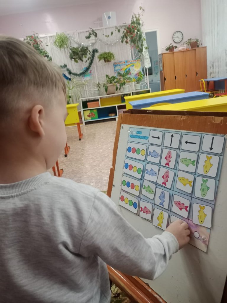 Д.и."түрлі-түсті балықтар"көмегімен математика негіздері бойынша аға топтағы жеке жұмыс. Бұл ойынның мақсаты балалардағы кеңістіктік ұғымдарды дамытуға және берілген параметрлер бойынша объектінің жазықтықта орналасуына бағытталған.