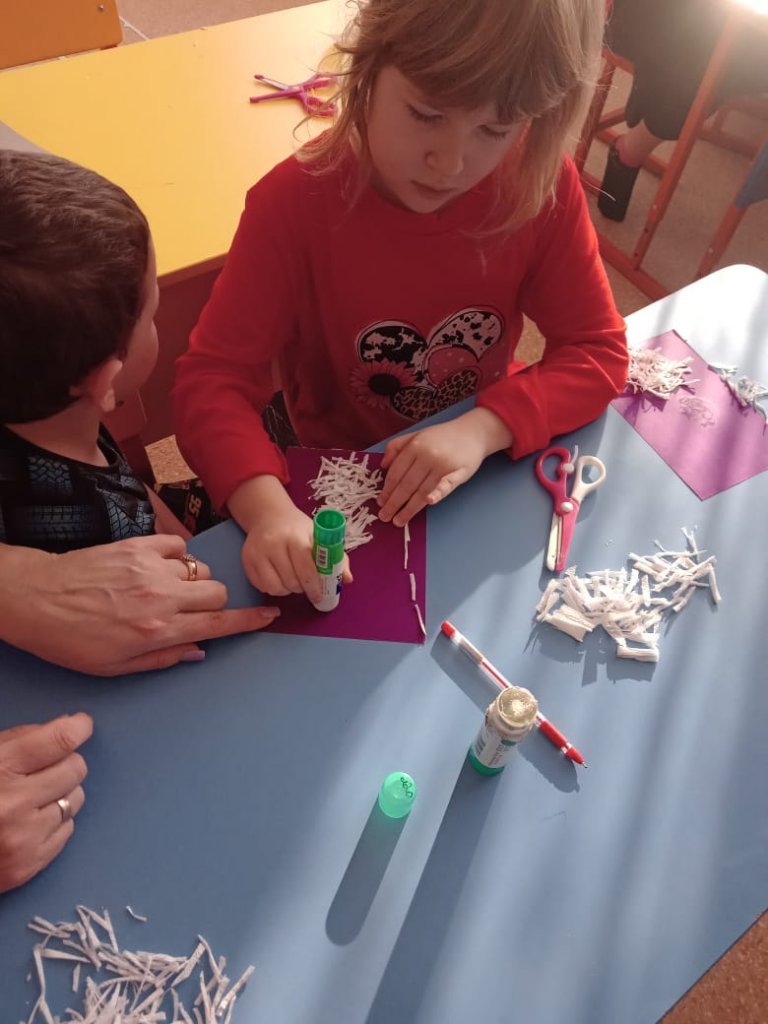 Арт-студияда балалар майлықтардың кесілген жолақтарынан "Снеговик" қосымшасын орындады. Ақ майлықтар жолақтарға кесіліп, негізге жабыстырылып, аққаланың көлемді денесін жасады.