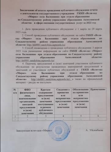 Государственное коммунальное казённое предприятие"Ясли- сад "Мирас" села Балкашино при отделе образования по Сандыктаускому району управления образования Акмолинской области"