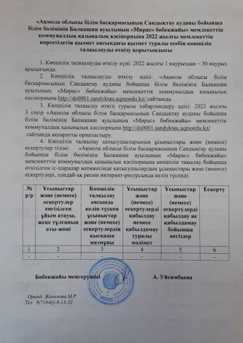 "Ақмола облысы білім  басқармасының Сандықтау ауданы бойынша білім бөлімінің жанындағы Балкашин ауылының "Мирас"бөбекжайы" мемлекеттік коммуналдық қазыналық кәсіпорнына