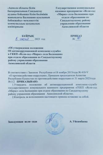 Государственное коммунальное казённое предприятие"Ясли- сад "Мирас" села Балкашино при отделе образования по Сандыктаускому району управления образования Акмолинской области"