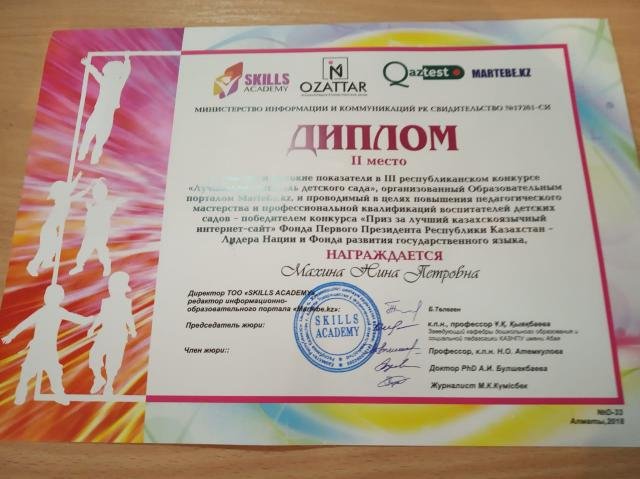 Воспитатель высшей категории Махина Нина Петровна приняла участие в III республиканском конкурсе «Лучший воспитатель детского сада», организованный Образовательным порталом Маrtеbe.kz, и проводимый в целях повышения педагогического мастерства и...