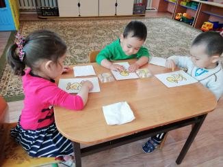 Мақсаты: балалардың ұсақ қол моторикасын, зейінін дамыту; түстерді ажырата білуге үйрету; ұқыптылыққа тәрбиелеу.