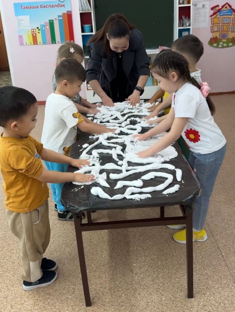 Ересек тобының балалары қазақтың ұлттық ою-өрнегін қағаз бетіне мақтаны желім арқылы жабыстырып, түрлі түспен бояды.