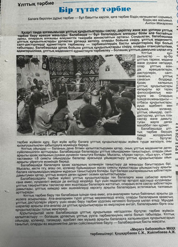 Ұлттық құндылықтарды дәріптеу мақсатындағы "Бір тұтас тәрбие" бағдарламасының маңызы туралы мақала жазған тәрбиешілер: Кошкарбаева С.Ж мен Жайлибаева А.Ж