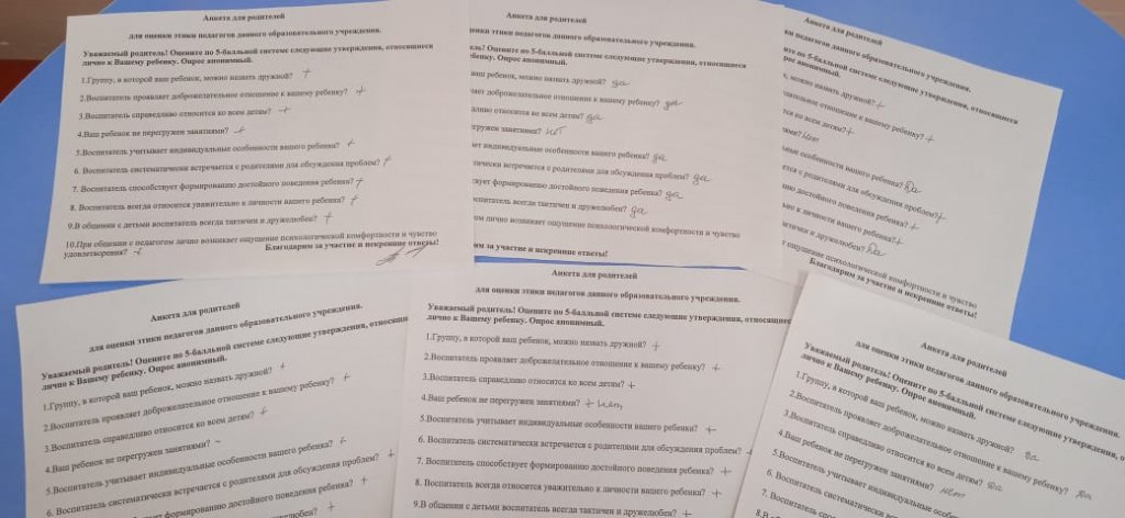 "Мирас" бөбекжай-бақшасы педагогтерінің этикасы мәселелері бойынша барлық жастағы топтардың ата-аналары арасында сауалнама жүргізілді. Ата-аналардың сауалнамаларында оң нәтиже көрінеді. Мұғалімдер этикалық нормаларды сақтайды, осылайша ата-аналар арасында...