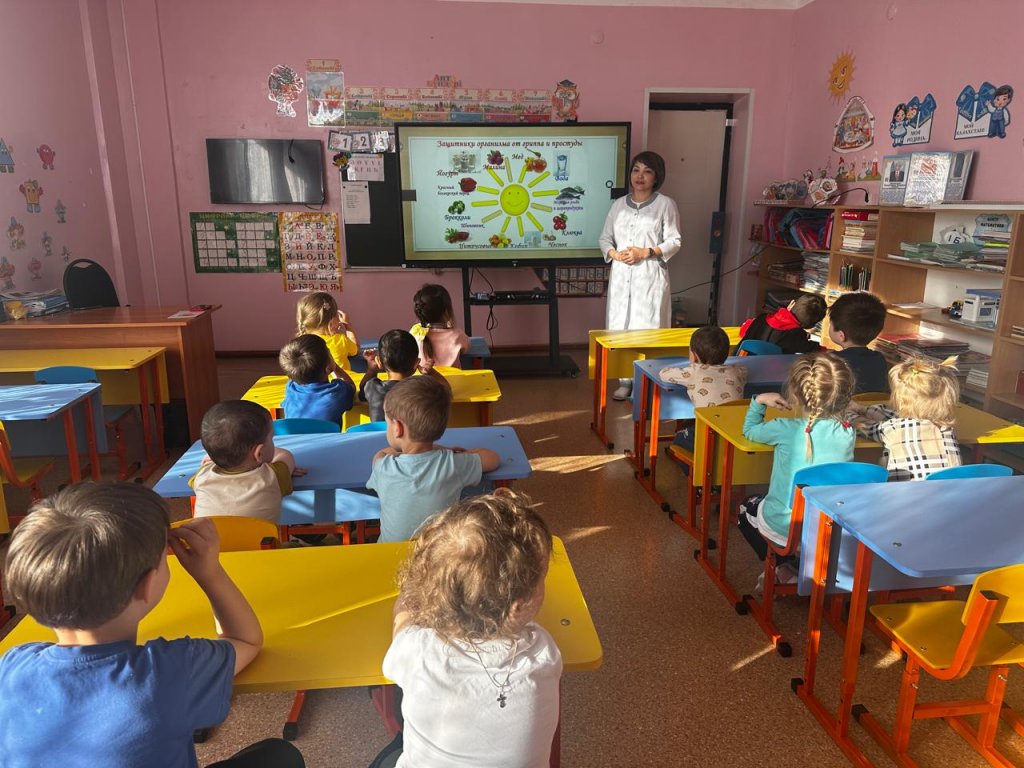 "Мирас» бөбекжайының дәрігері Есымбаева Т.Ж. балалармен “ЖРВИ және тұмаудың алдын алу” тақырыбында әңгіме өткізді.