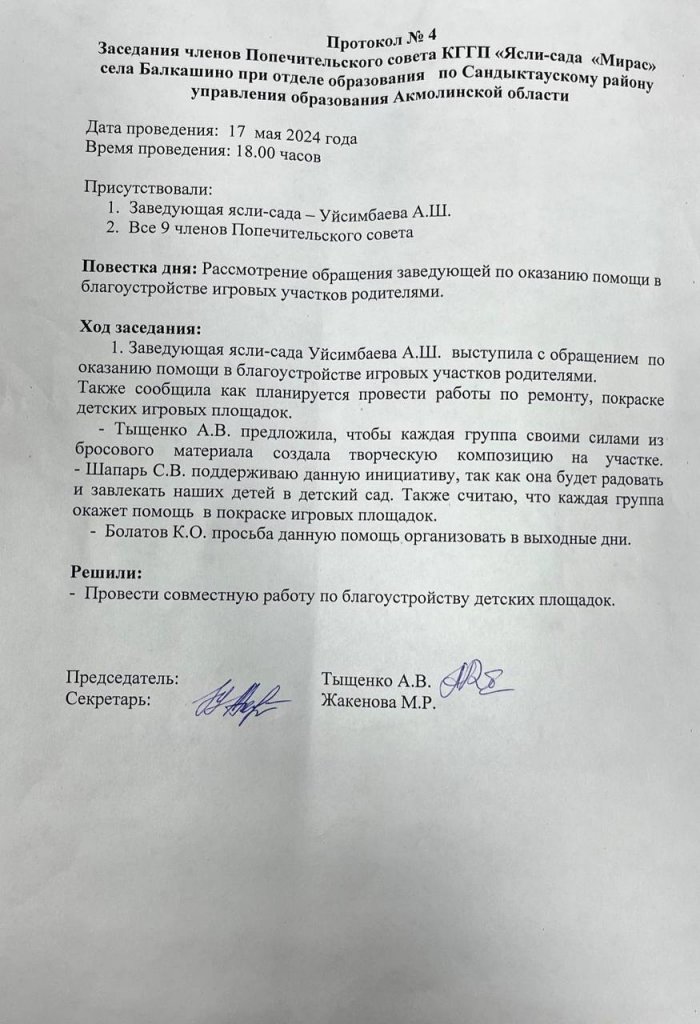 2024 жылғы 17 мамырда Қамқоршылық кеңес мүшелерінің отырысы өтті. Күн тәртібінде балалардың ойын алаңдарын абаттандыру мәселесі көтерілді. Педагогикалық ұжым мен ата-аналардың қатысуымен сенбілік өткізу туралы шешім қабылданды.