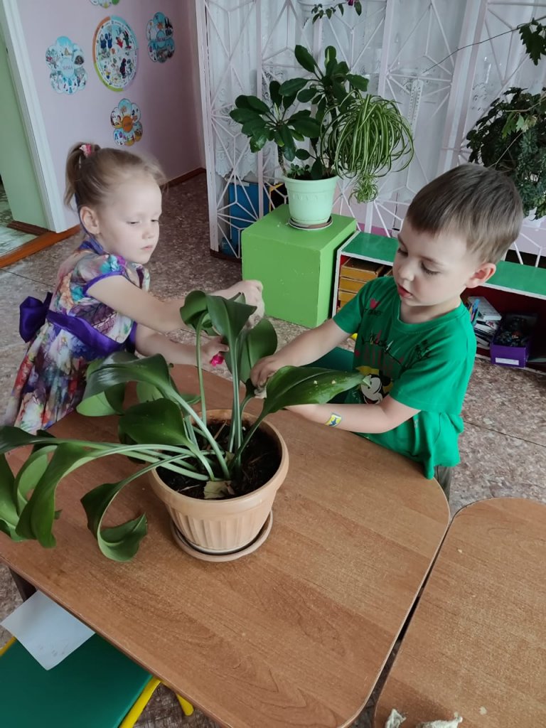 Үлкен топтағы күннің екінші жартысы «Жабық өсімдіктерге күтім жасау» еңбек әрекеті. Мақсаты: Бөлме өсімдігінің атын бекіту, оның бөліктерін (дің, жапырақтар) қайталау, балаларға қарапайым өсімдік күтімі дағдыларын жаттықтыру: суару, жапырақтардан шаңды сүрту,...