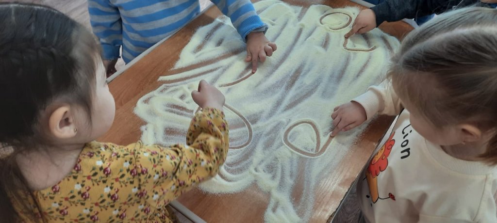 Балапан екінші топта Ұнтақ жарма және қарақұмық ты пайдаланып балалардың қол маторикасын жаттықтырды ұнтақ жарманың үстінен неше түрлі дөңгелектерді жасады.