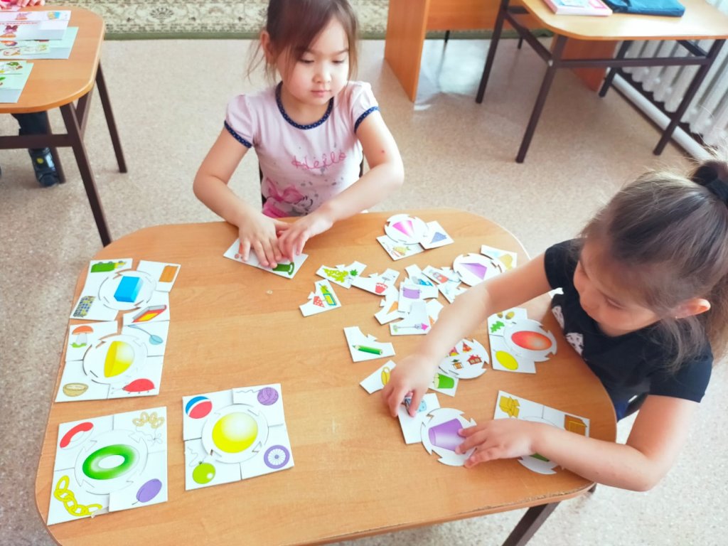 Ересек қазақ тобында балалар басылған үстел ойындарын ойнады, бұл ойындар балалардың зейінін, қиялын, логикалық ойлауын дамыту мақсатында қызығушылық пен танымдық қызығушылықты дамытуға арналған