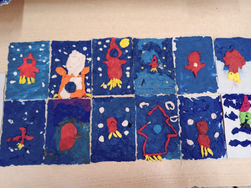 «Ромашка» үлкен тобында ғарышкерлер күніне арналған тақырыптық сабақ өтті. Балалар астронавтика тарихымен, батыр ғарышкерлермен танысты. Сабақта балалар өздерінің ғарыш кемелерін жасап, қиялдарын, шығармашылықтарын көрсетті.