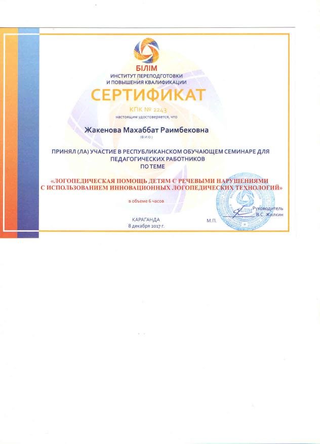 Логопед детского сада Жакенова Махаббат Раимбековна приняла участие в дистанционном Республиканском обучающем семинаре для педагогических работников в г.Караганда по теме: "Логопедическая помощь детям с речевыми нарушениями с использованием инновационных...