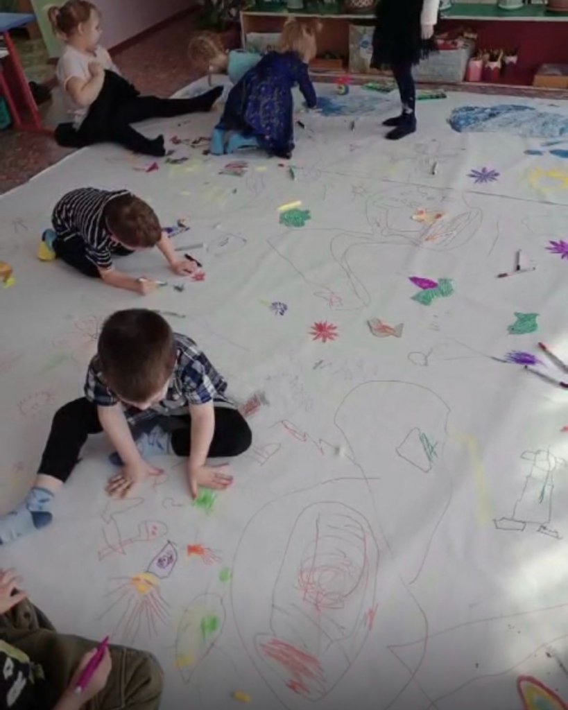 Балабақшада едендегі көркем суреттер ойын мен шығармашылықтың таңғажайып атмосферасын жасайды.