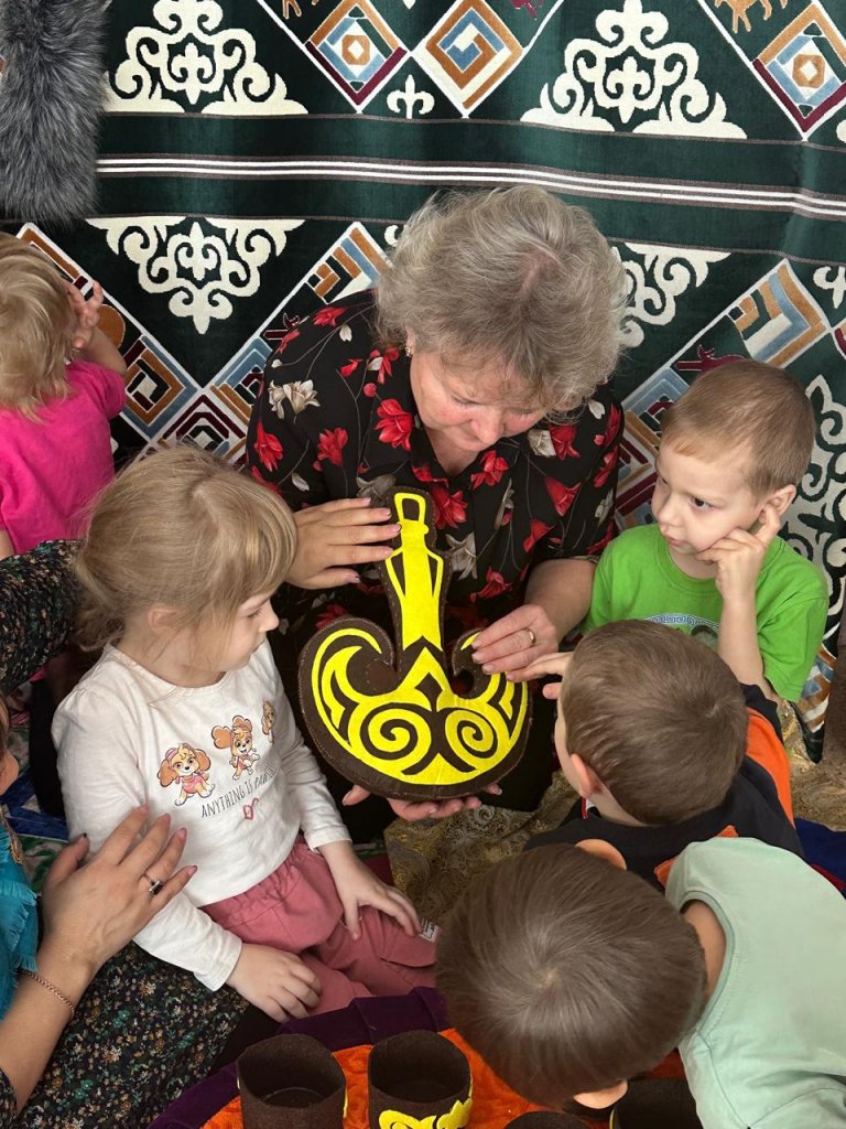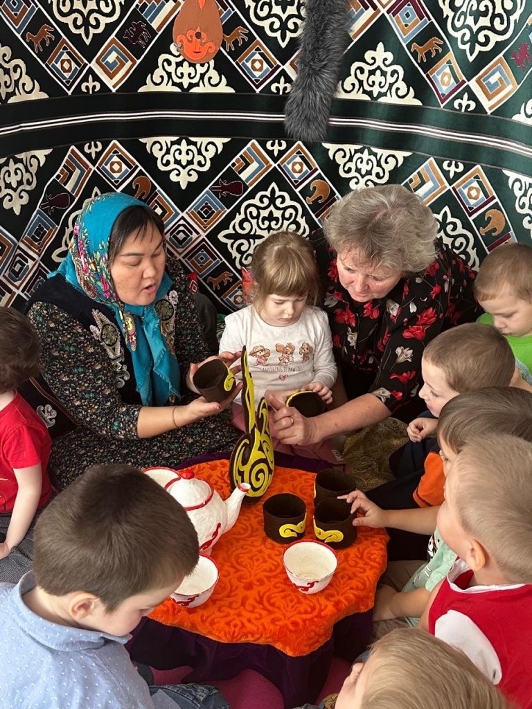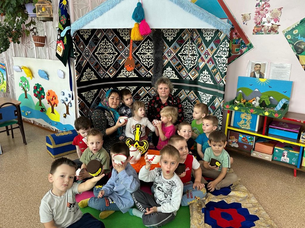 Ересек тобының бүлдіршіндерімен "Менің дана әжем" атты дөңгелек үстел өтті. Дана әжеміз балаларды ұлттық ыдыстарымызбен таныстырып, олардың маңызын және де ата-бабаларымыз қалай қолданғаны жөнінде ақпарат берді.