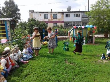 Ребятами старшей группы совместно с воспитателем было подготовлено развлечение для детей младшей группы. Для проведения выбрали теплый летний день и организовали отдых на свежем воздухе, на участке детского сада. Целью этого мероприятия является стремление сплотить детский коллектив, учить заботиться о младших, воспитание добрых взаимоотношений через сказку.