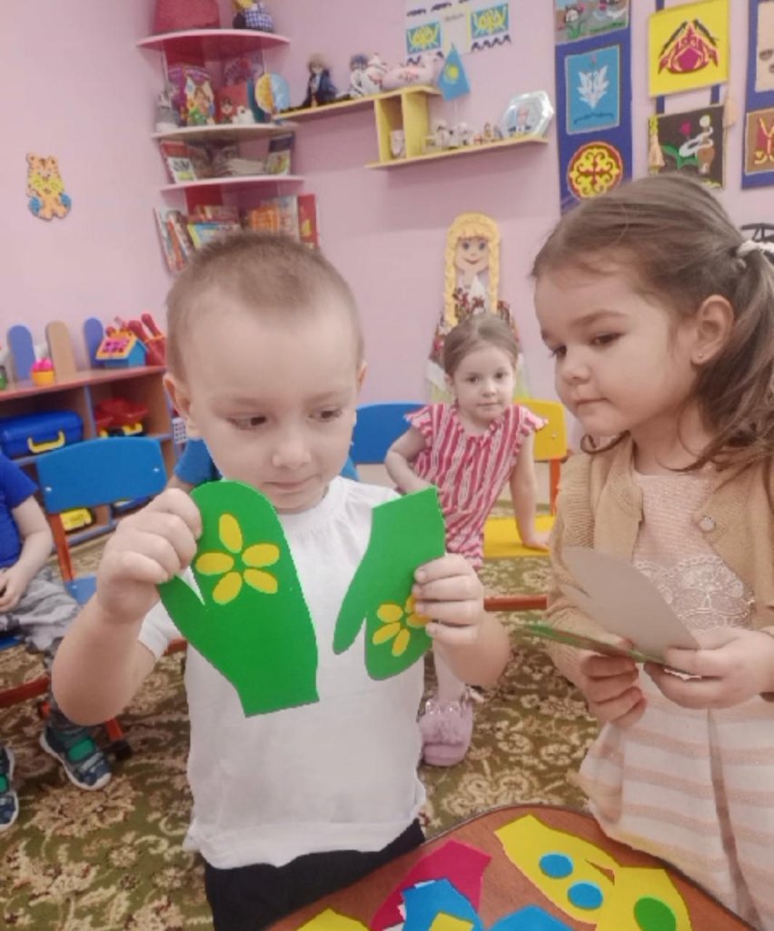 Орта топтағы дидактикалық ойын "Сыңарын тап". Бұл ойынның мақсаты - визуалды қабылдауды дамыту, геометриялық фигураларды, түстерді бекіту. Ойынның нәтижесі қолғаптарды безендіру және сурет салу.