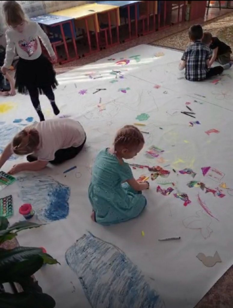 Балабақшада едендегі көркем суреттер ойын мен шығармашылықтың таңғажайып атмосферасын жасайды.