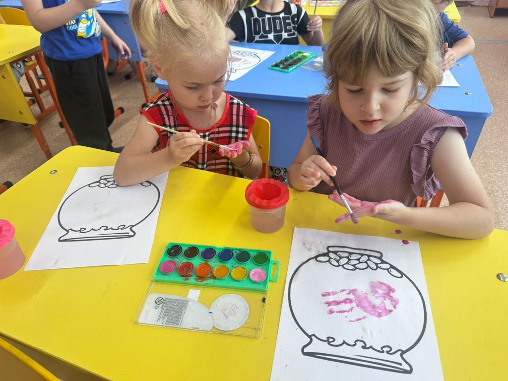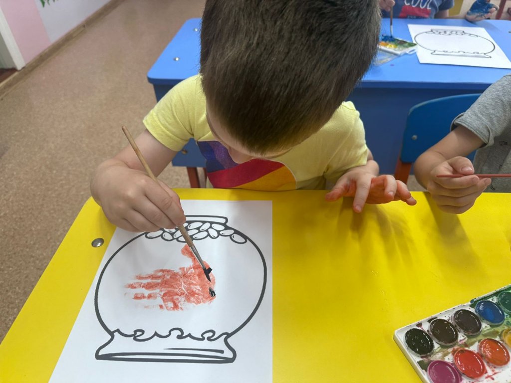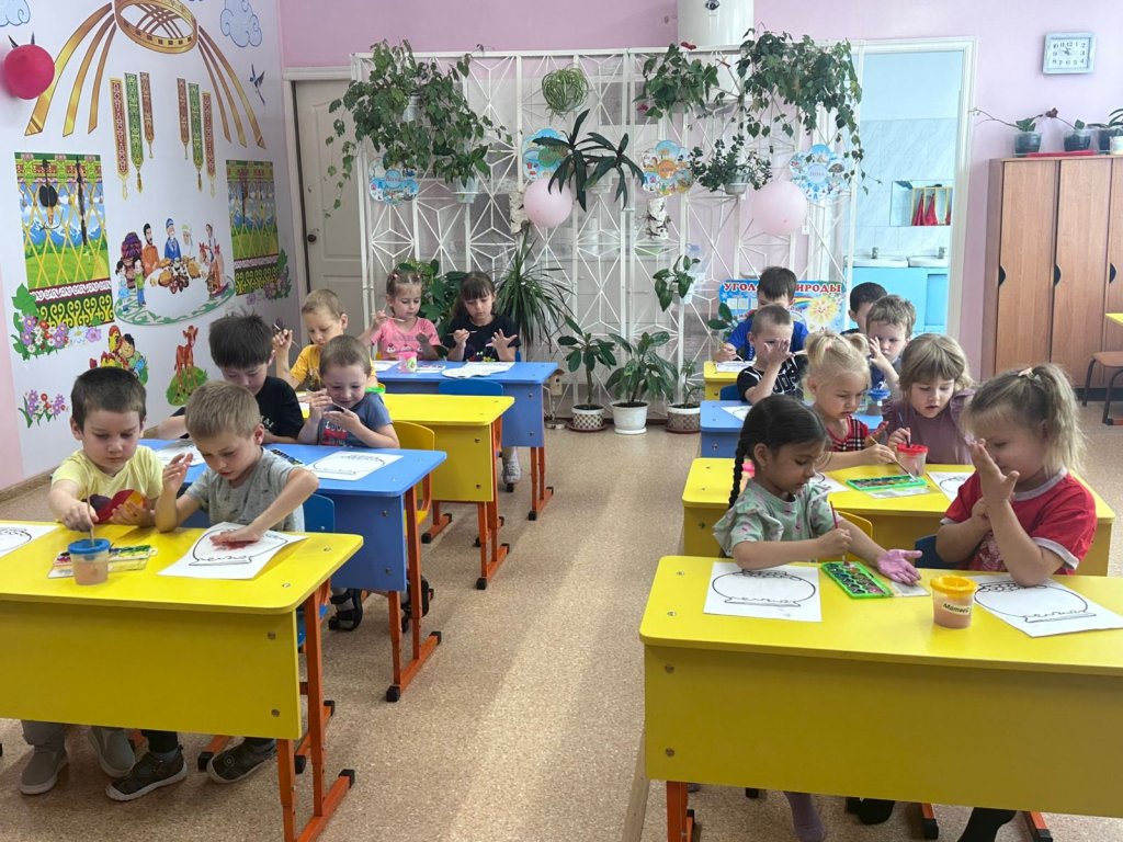 Мақсаты: балаларды бояулармен жұмыс жасау техникасында жаттықтыру. Алақанмен сурет салу қабілетін бекіту.