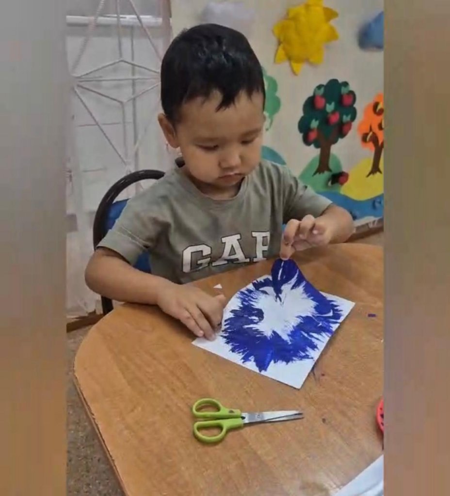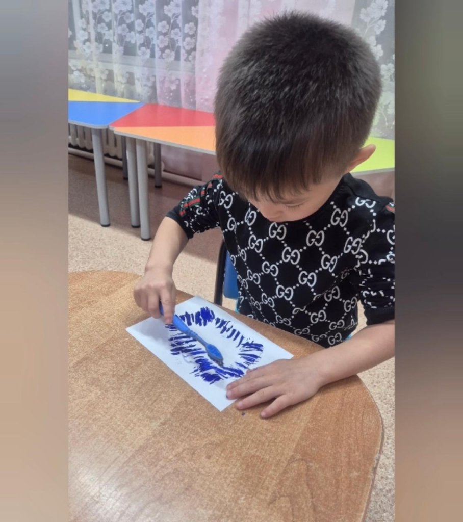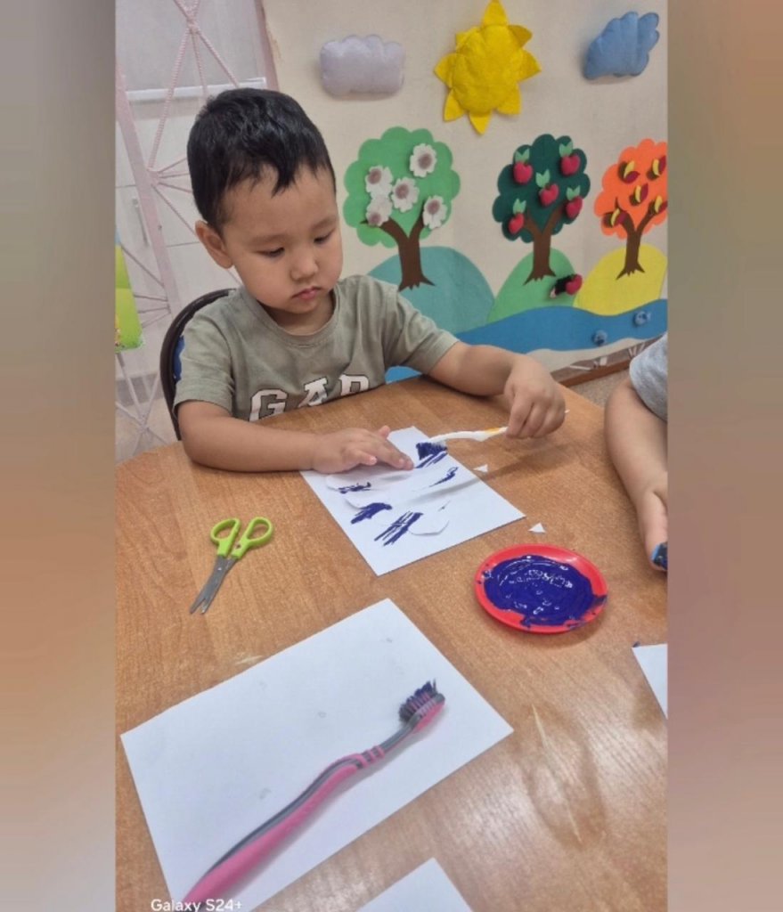 Ересек тобы дәстүрден тыс сурет салу тәсілімен ағаштың суретін салды.Ол үшін трафарет пен тіс щеткасын қолданды. Жұмыс барысы балаларға қызықты болды, белсене қатысты
