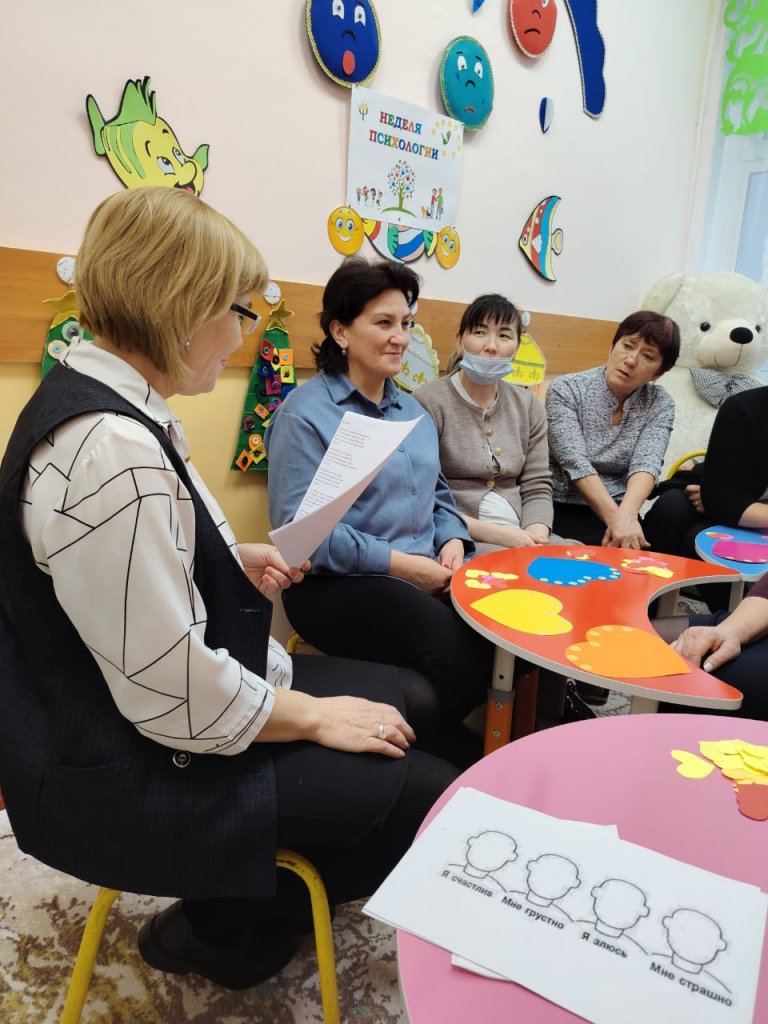 Психология апталығының соңында мұғалімдермен «Отырып, сөйлесейік» атты диалогтық сессия өткізілді. Қатысушылар іс-шарамен байланысты көңіл-күйлерін суретке түсіріп, «Бас киім» атты ойын ойнап, бойларына сіңіргісі келетін қасиеттерді анықтап, ырғақты жылыту жаттығулары туралы білді. Іс-шара барысында мейірімділік, көңілділік және өзара қолдау атмосферасы орнады.