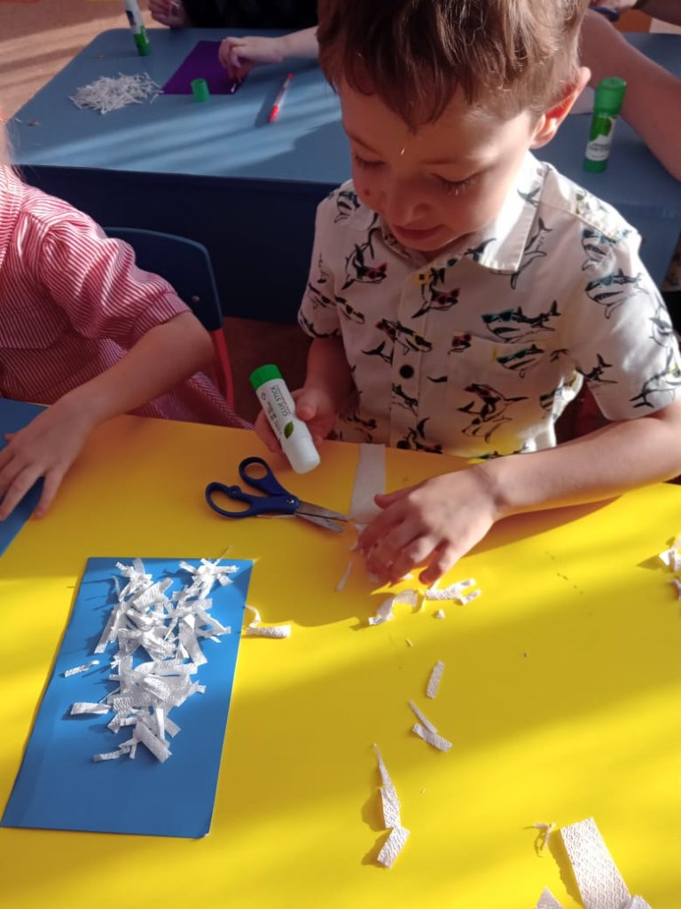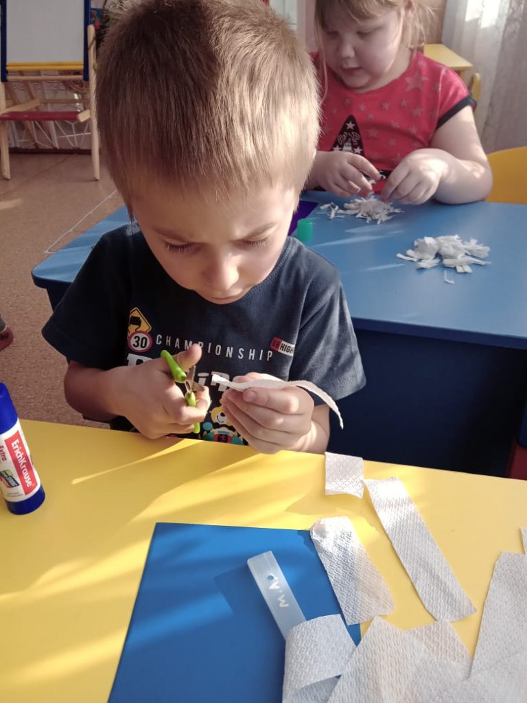 Көркемсурет студиясында балалар майлықтың кесілген жолақтарын пайдаланып, «Ақшақар» аппликациясын жасады. Ақ майлықтар жолақтарға кесіліп, негізге желімделіп, ақшақардың үш өлшемді денесін жасады.