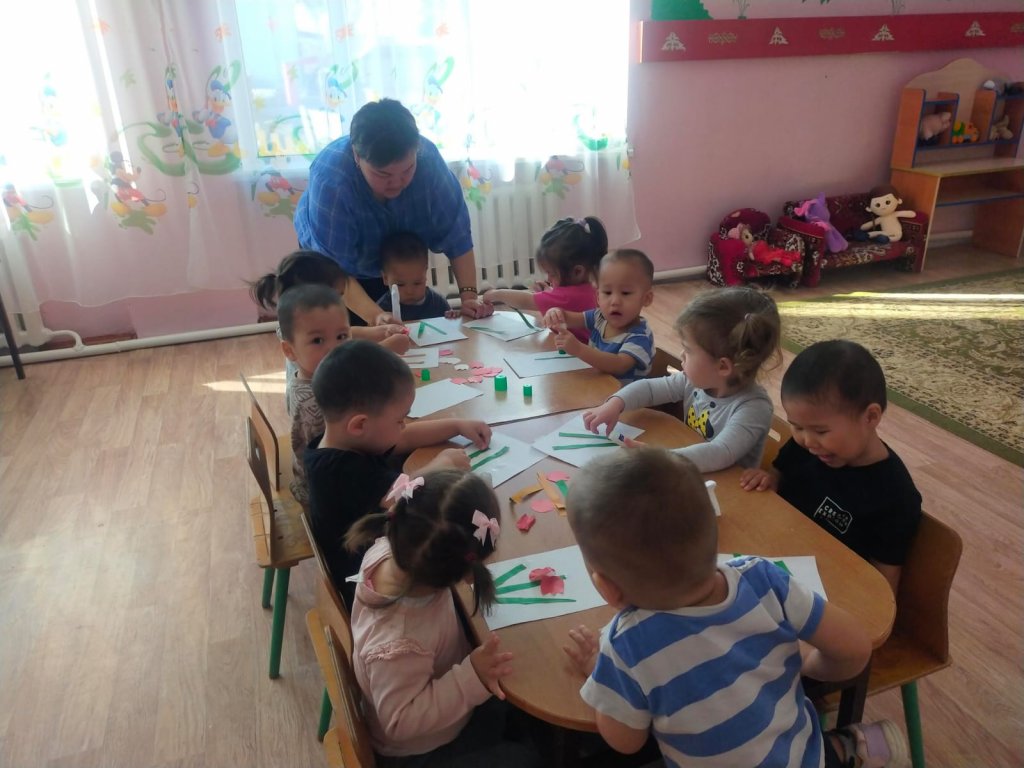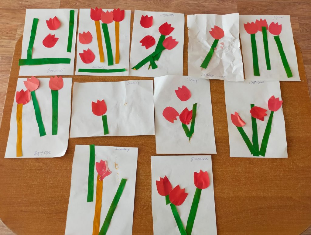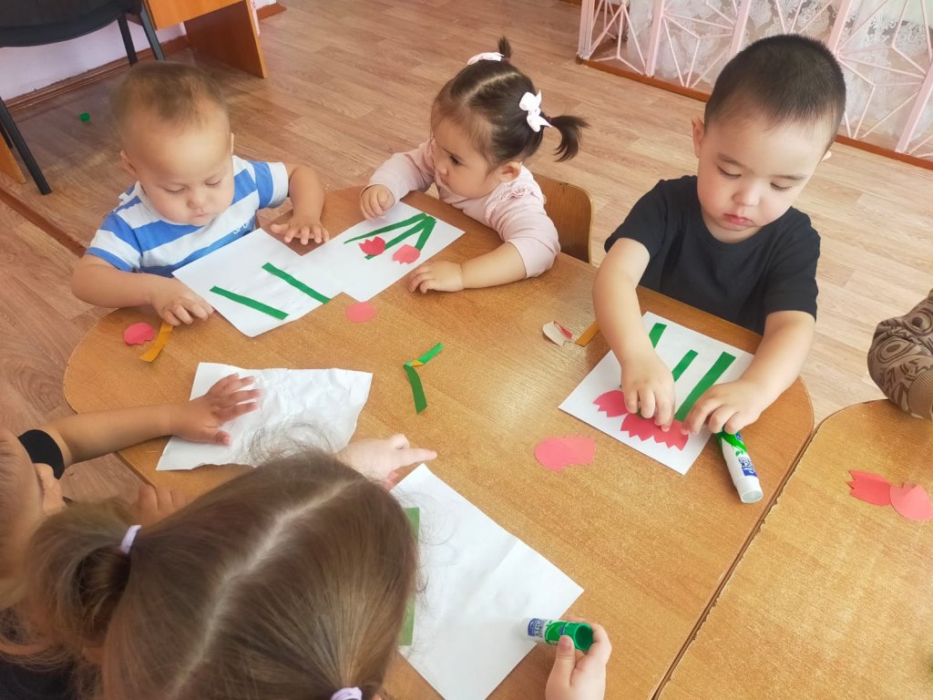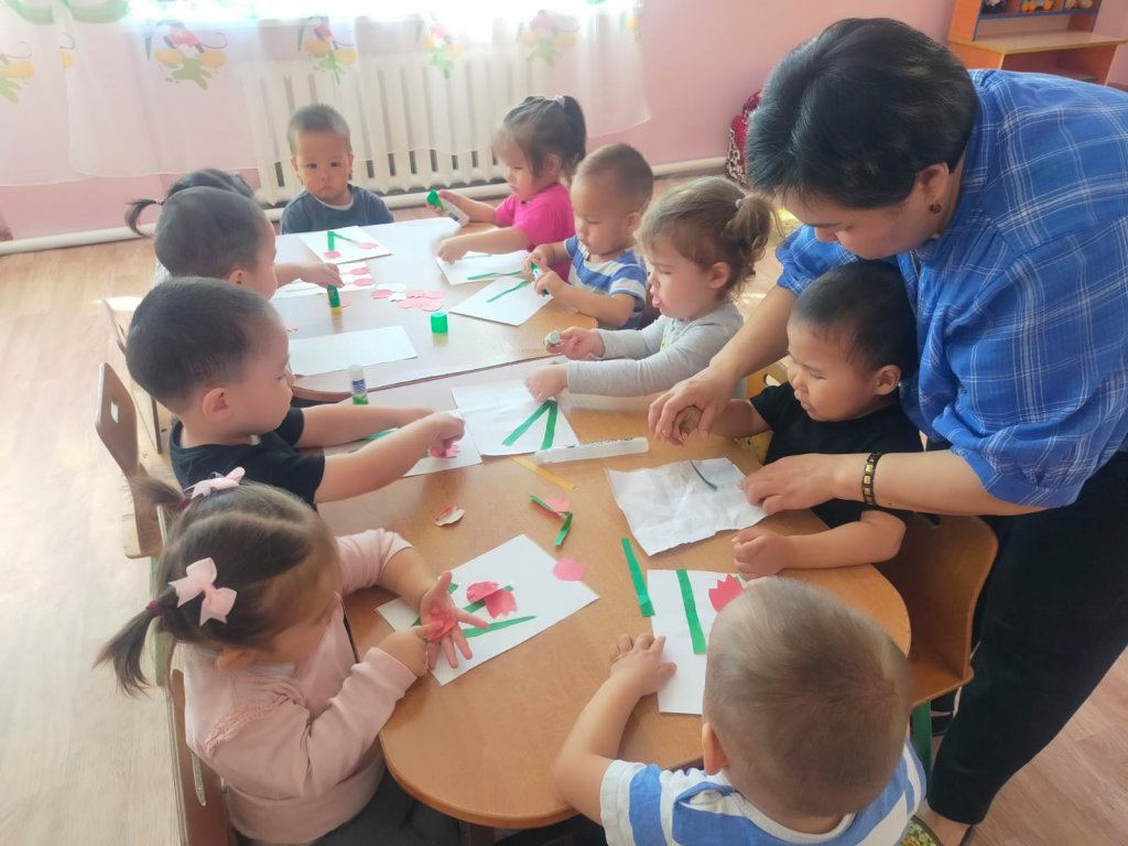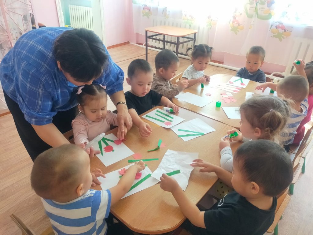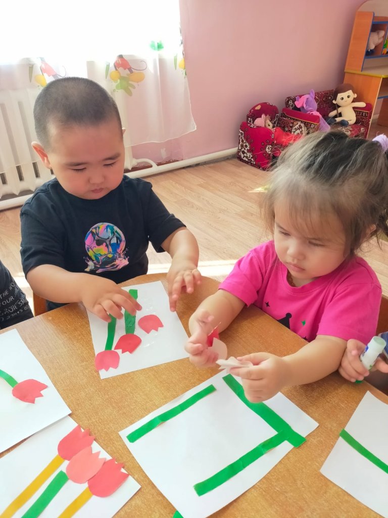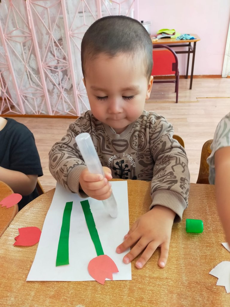 Дайын бөлшектерді (гүл, сабақ, т. б) дұрыс жапсыруға үйрету Түстерді ажырату (қызыл, жасыл) Ұқыптылыққа тәрбиелеу Табиғатқа деген сүйіспеншілікті арттыру 🌿