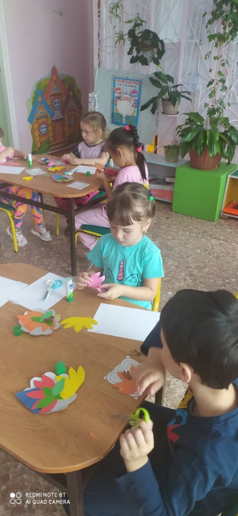 Бүгін жоғары топта көлемдік аппликацияны енгізу бойынша сабақ өткізілді. Тапсырма оңай болған жоқ, жапырақшаларды жаңаша бұрап, гүлді бүршікке айналдыру қажет болды, қиын, бірақ қызықты. Балалар өз қиялдарын көрсетуге тырысты және композицияға өздеріне тән нәрсені енгізді, соңында барлығы жаңа, қиын тапсырманы жеңді. Кешке әр бала вазаға салынған әдемі букетті мақтанышпен анасына сыйлады.
