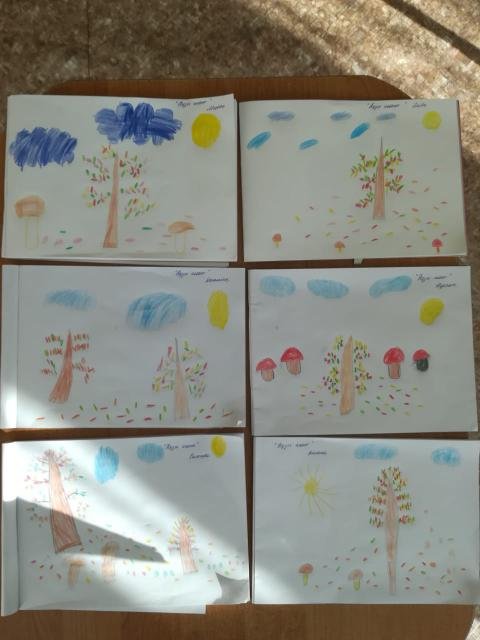 Маусымдық өзгерістерге назар аудару. Иллюстрациялық суреттермен жұмыс жасау. Балалар күз мезгілінде құстар жылы жаққа ұшып кететінін, жапырақтар сарғайып жерге түсетіндерін, дала суып, жаңбыр жиі жауатындарына көңіл бөліп, білімдері кеңейеді.