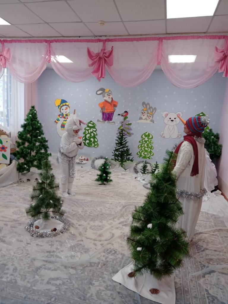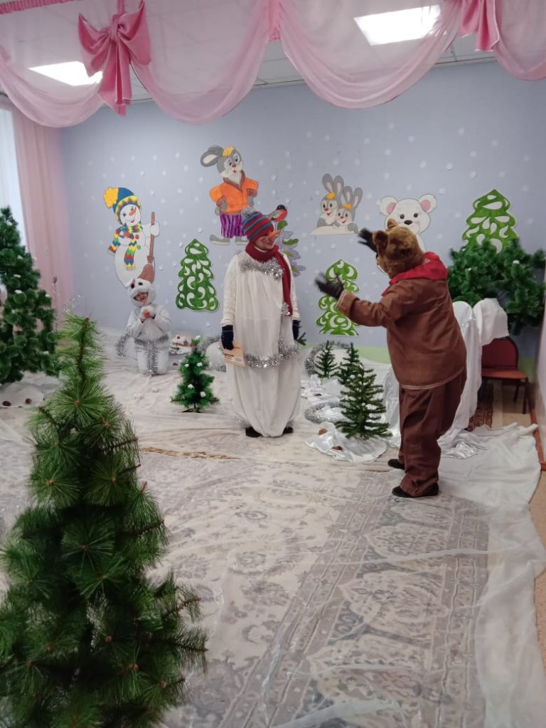 Ертегі кейіпкерлерінің жарқыраған киімдері, декорациялар, сырлы атмосфера – балабақшаның музыкалық залы театрландырылған сахнаға айналды. Ертегіші рөлін педагог-психолог Ашуркова Т.М., көңілді қар адамы дене шынықтыру нұсқаушысы Исмагулова А.С.; Кожевникова Г.Н.- тәрбиеші, қоян рөлін сомдаған; аю рөлін педагог Шурманова Д.Г., айлакер түлкінің рөлін педагог-Аносова М.А., қар қызы-мұғалім-логопед Жакенова М.Р.