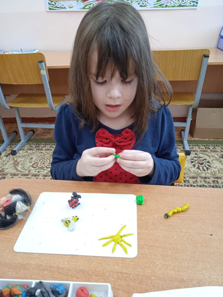 Қолдың ұсақ моторикасын дамыту және «Жәндіктер» тақырыбы бойынша білімдерін бекіту мақсатында жеке сабақ өткізілді. Қыз ара, ледибуг жасапты. Көтеріңкі көңіл-күймен қыз топқа оралды