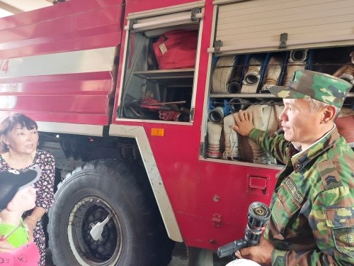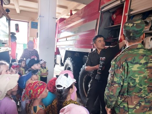 Ынтымағы жарасқан ротамыз келгенде бізді кадр бөлімінің командирі күтіп алып, экскурсия жасауға ықыласпен келісті. Бізді ең бірінші таныстырған өрт сөндіру бөлімінің жұмыс тәртібі болды. Бөлімшелер өрт сөндірушілер демалатын демалыс бөлмесімен, өрт сөндіру машиналары тұратын гаражбен, өрт сөндірушілерді оқытуға арналған жолақпен танысты. Балалар арнайы көліктің қалай жұмыс істейтінін, өрт сөндірушінің қандай форма киетінін және өртке шығуға қанша уақыт дайын болуы керектігін үлкен қызығушылықпен тамашалады. Балалар көптеген сұрақтар қойып, оларға қызықты жауаптар алды.