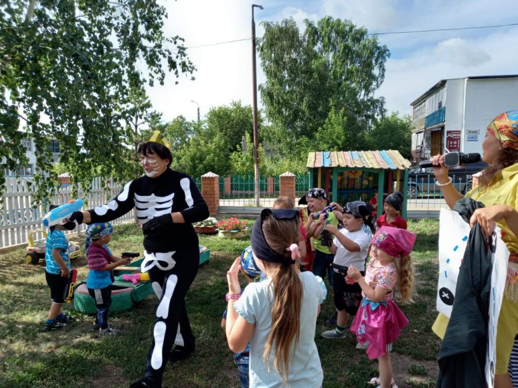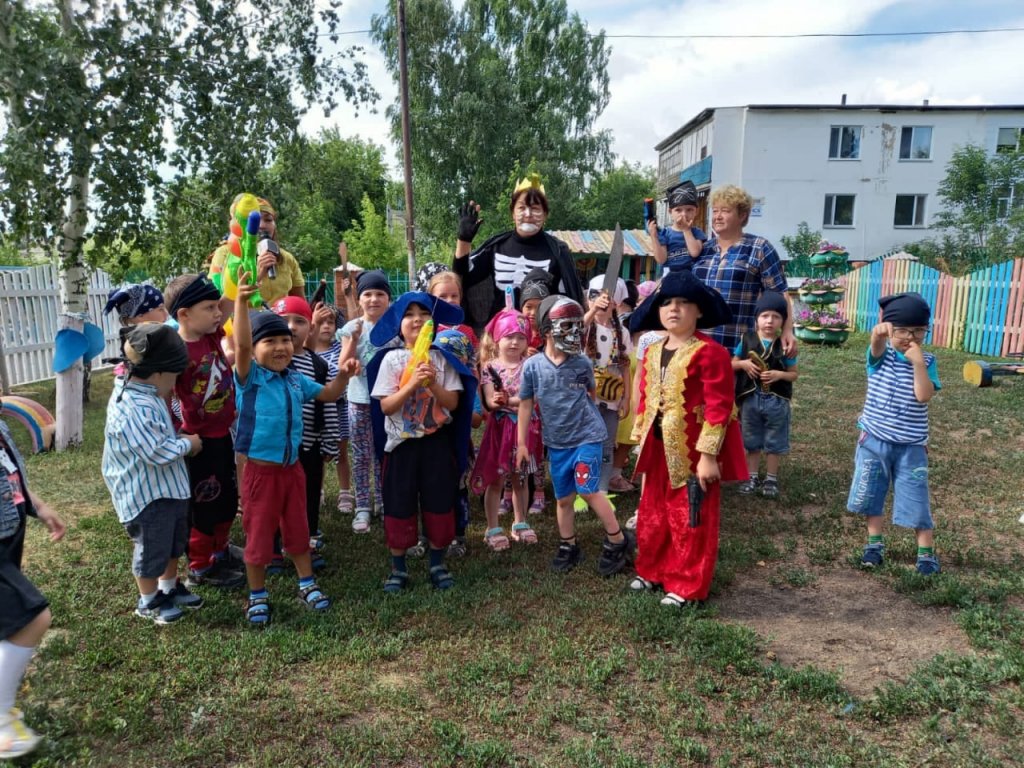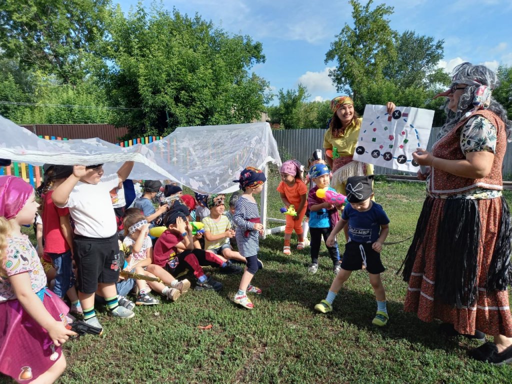 - өзара көмек сезімін тәрбиелеу. Теңіз қарақшыларымен киінген балаларға қазына іздеуге сиқырлы кемеге бару ұсынылды. Бірақ жолда олар қарақшыларға кедергі жасағысы келген Кощей, Баба яга сияқты кейіпкерлерді кездестірді. Балалар ұсынылған тапсырмаларды оңай орындап, сүйікті ойындарын қуана ойнады!