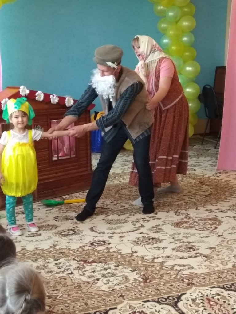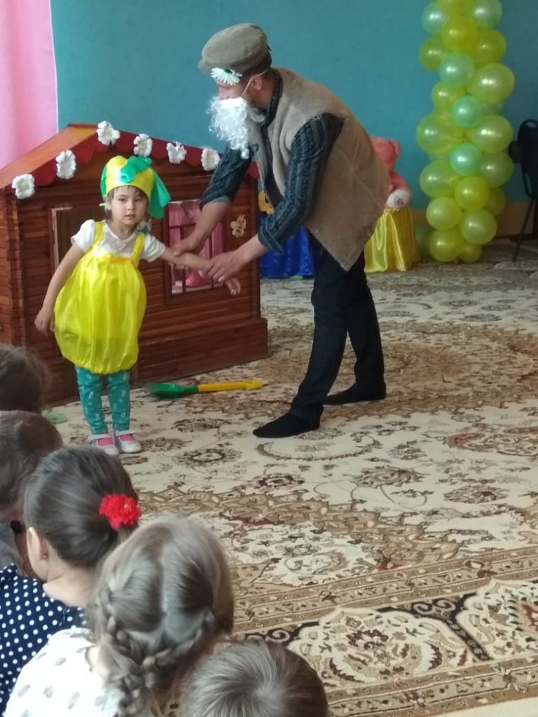 «Шалқан» ертегісін сахналау, (дайындық топ) Мақсаты: балалардың қиялын, зейінін, есте сақтау қабілетін, эмоционалдық саласын, сөйлеу мәнерлілігін дамыту, коммуникативтік белсенділік пен қимыл-қозғалыс әрекетін ұштастыра жетілдіру. Рөлдерді бөлу кезінде балалардың темпераменті, эмоционалдық көңіл-күйі ескерілді. Батырлардың киімдерін тігумен «Шығармашылық шеберхана» (мұғалімдер мен ата-аналардың шығармашылық одағы) айналысты. Бұл шараға ата-аналар шақырылып, өткізіліп жатқан акцияға риза болды.