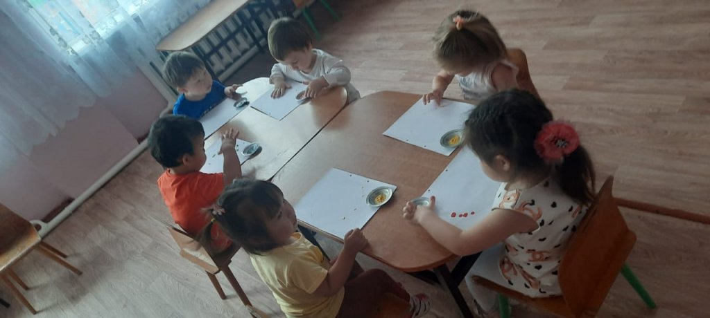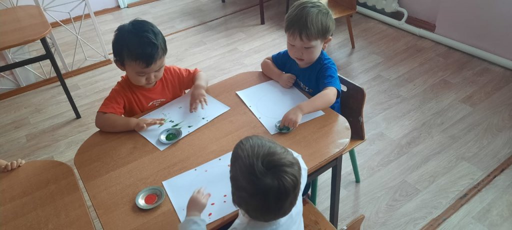 Бүгін екінші кіші топта дәстүрлі емес тұрғыда сурет салу өткізілді.Балалар саусақтарымен жұмыс жасай отырып түстерді де меңгерді. Балалар өз жұмыстарын ұқыпты әдемі жасауға тырысты және жұмыстарын аяғына дейін жеткізе алды.