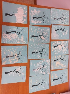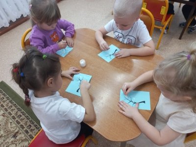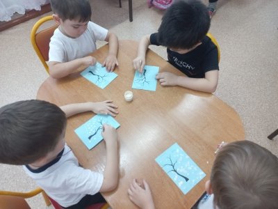Ортаңғы топта балаларға дәстүрлі емес сурет салу әдістерін үйрету, қыс мезгілі туралы білімдерін нақтылау және жалпылау мақсатында «Зимушка қысы» мақта тампонымен сурет салу сабағы өткізілді.