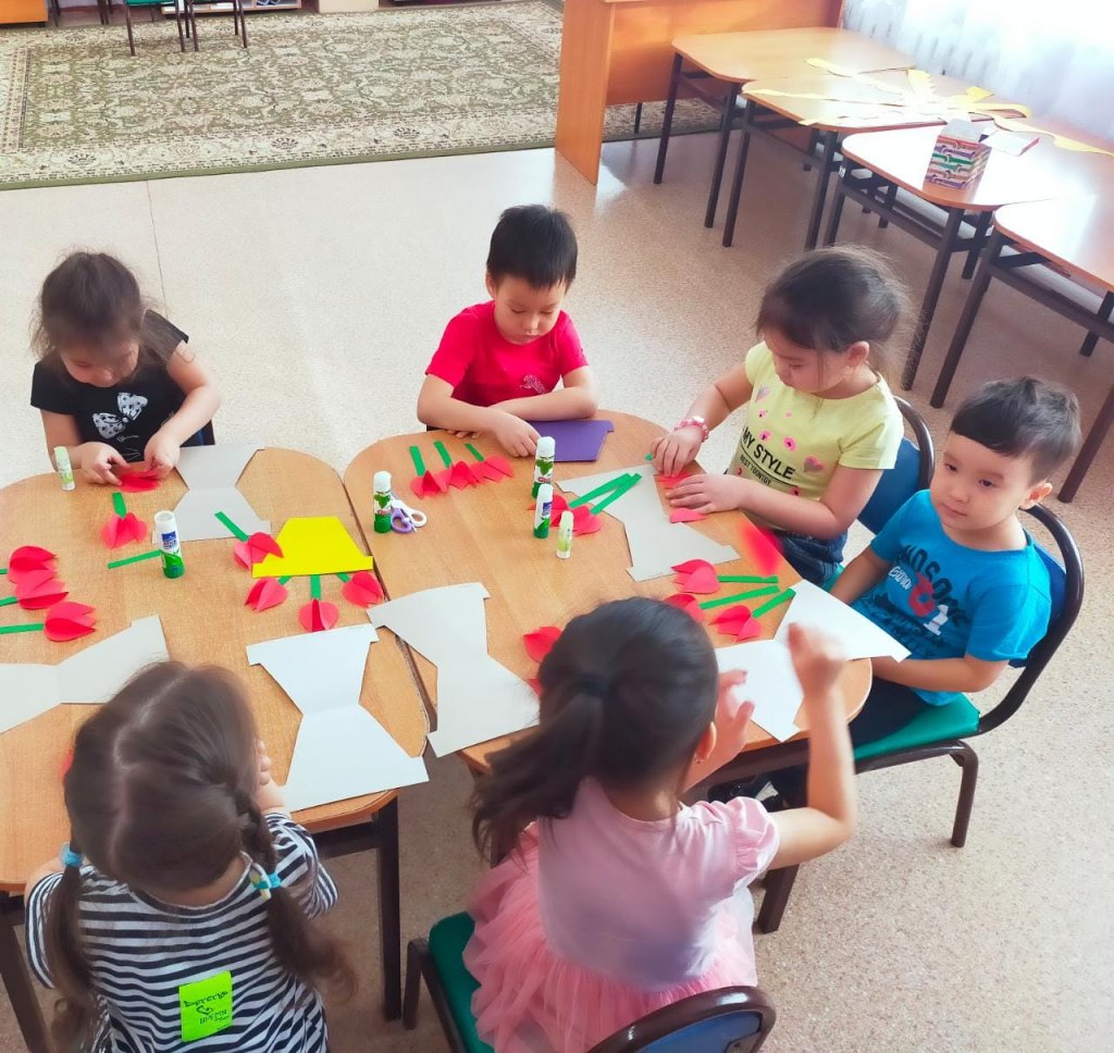 Ересек қазақ тобында " Әдемі гүл" ұйымдастырылған іс әрекеті өтті. Балалардың шығармашылық қиялын дамыту дағдыларын қалыптастыру. Гүл сабағын, жапырағын, күлтелерін қиып алып, әдемі гүл құрастырып жапсыру. Әсемдікке баулу, эстетикалық талғамын дамыту. Желіммен жұмыс жасағанда ұқыпты болуға тәрбиелеу.