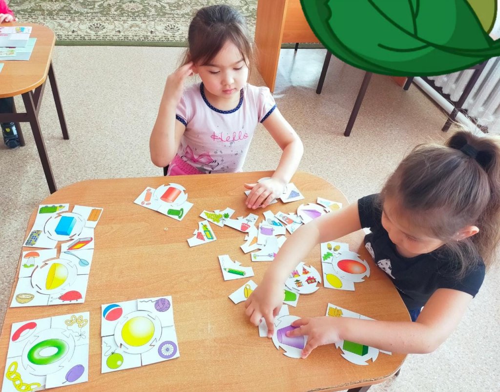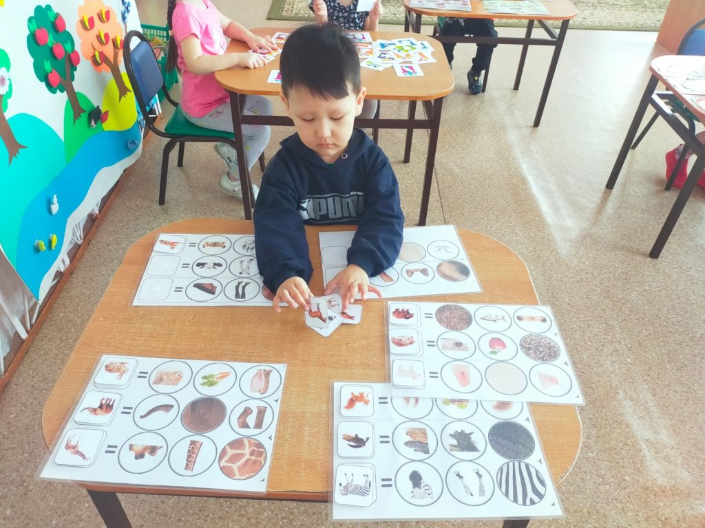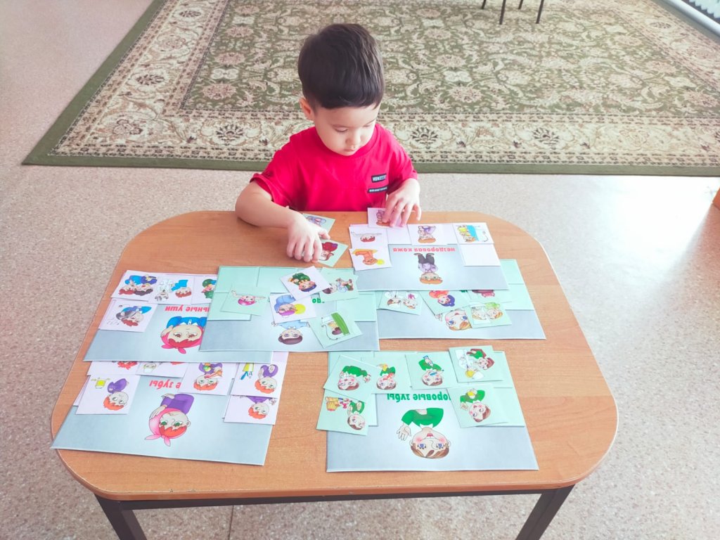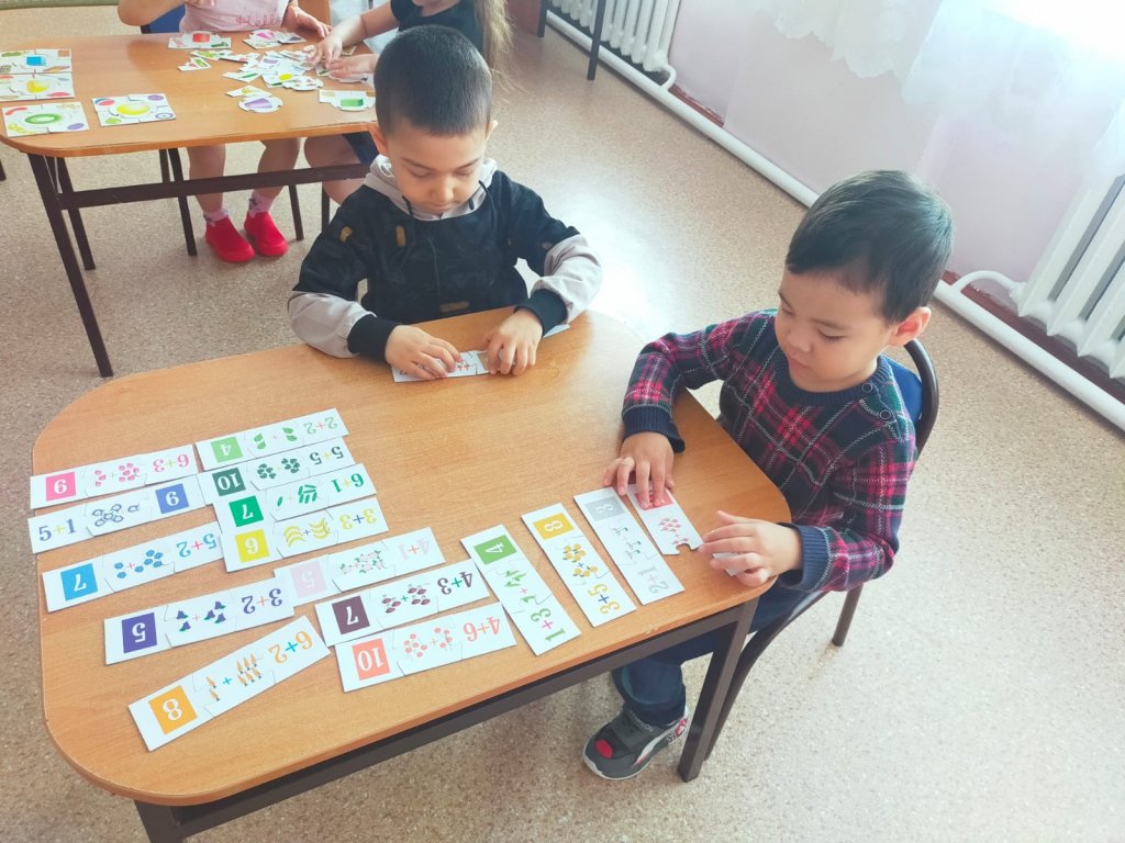 Ересек қазақ тобында балалар басылған үстел ойындарын ойнады, бұл ойындар балалардың зейінін, қиялын, логикалық ойлауын дамыту мақсатында қызығушылық пен танымдық қызығушылықты дамытуға арналған