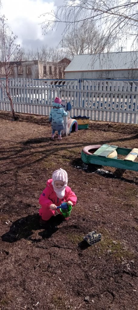 Сәуірдің шуақты күндерінде кіші «Солнышко» тобының бүлдіршіндері серуендейді. Ойындық және танымдық іс-әрекеттерді ұйымдастыру үшін тегін доп ойындары, қашықтықтан материалдармен ойындар, табиғатты бақылаулар өткізіледі.