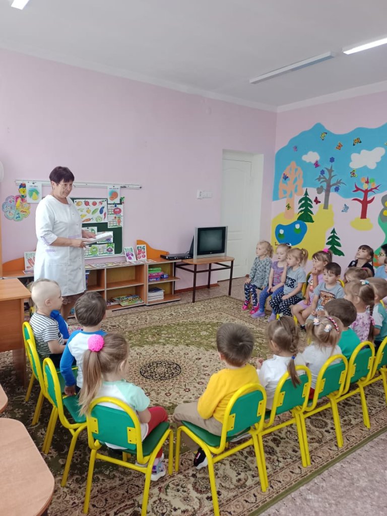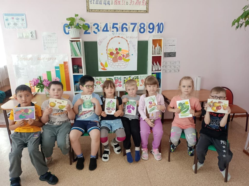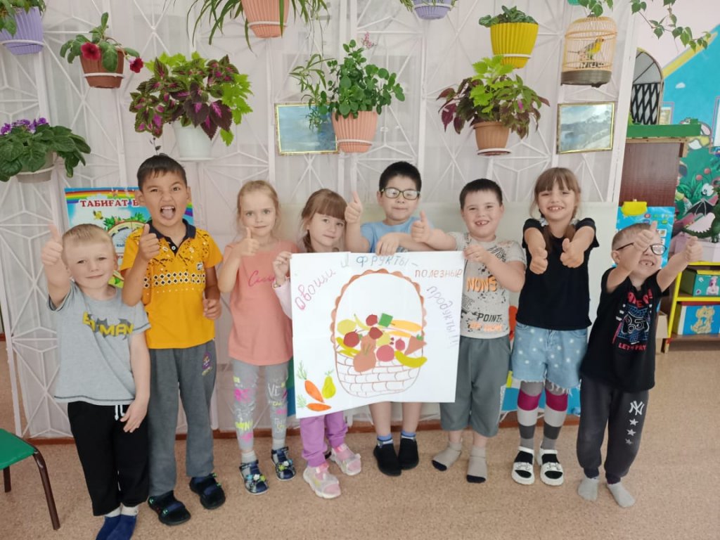 Дайындық тобының түлектерімен «Көкөністер мен жемістер, пайдалы өнімдер» атты танымдық викторина өткізілді.Мейірбике жігіттермен пайдалы және зиянды өнімдер, витаминдердің пайдасы туралы әңгімеледі. Одан кейін балалар жұмбақтарды тауып, мақал-мәтелдерді еске түсіріп, соңында «Денсаулық қоржыны» ұжымдық өтінімін толтырды.