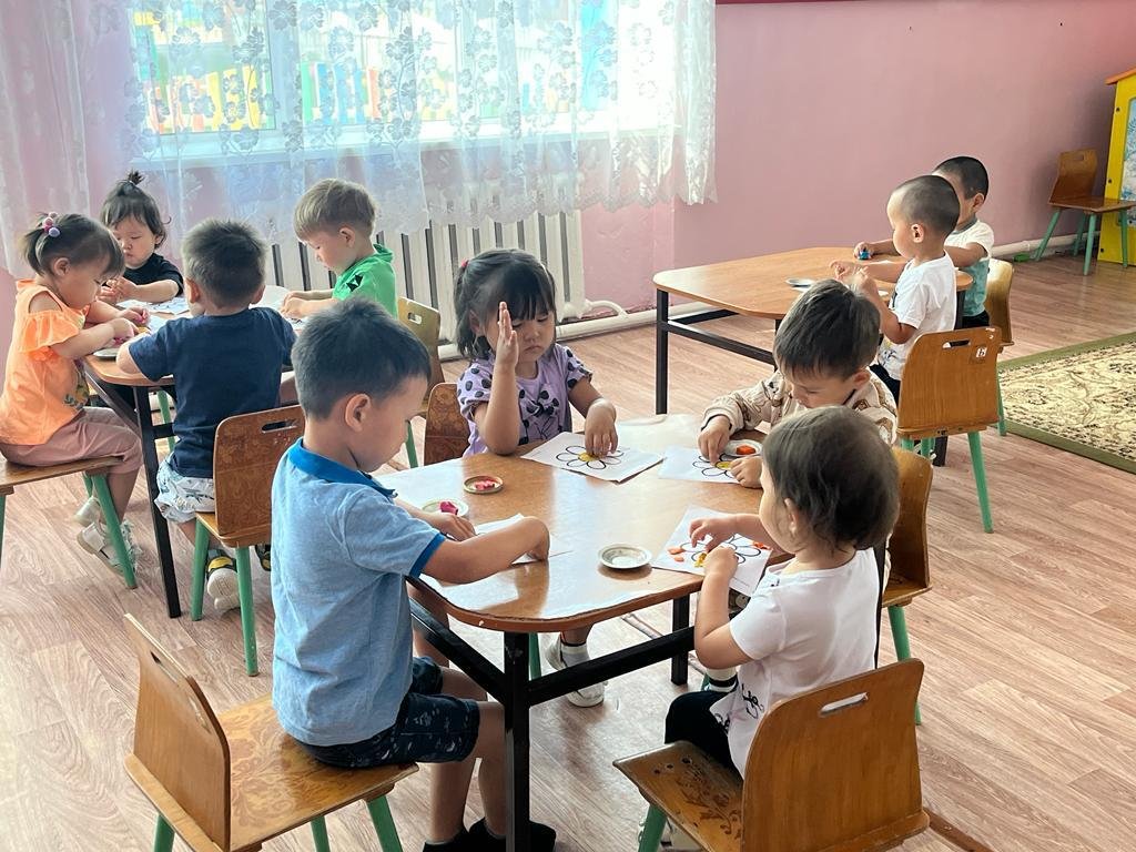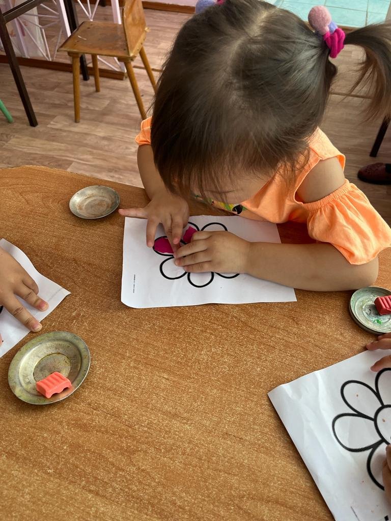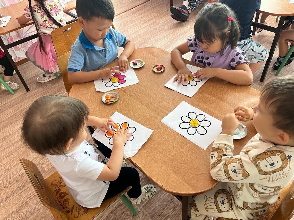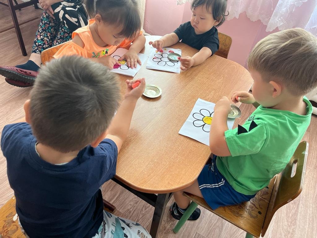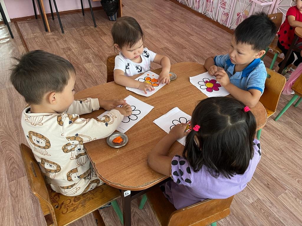 Гүлдің жапырақшаларының үстінен саусақпен пластилинді жағу немесе контур жасау дағдысын қалыптастыру.