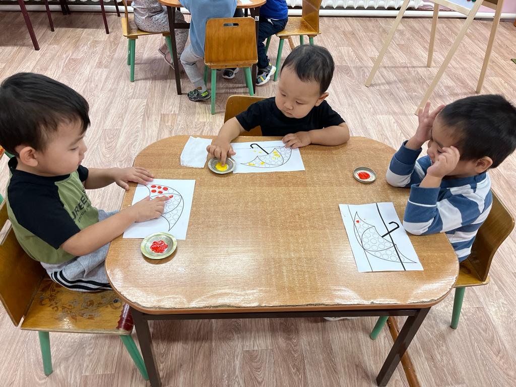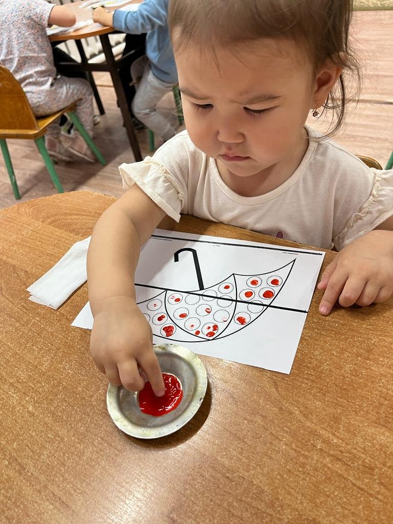 Бүгін балапан тобында Дәртүрлі емес жұмыс технадогиясы өткізілді. Қолшатырдың суреті арқылы саусақтарын шынықтара отырып,саусақтарының көмегімен қолшптырды бояды. Осындай жұмыс түрлері балаларға өте қызық.