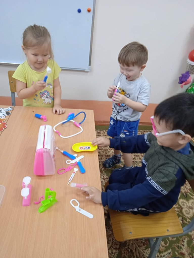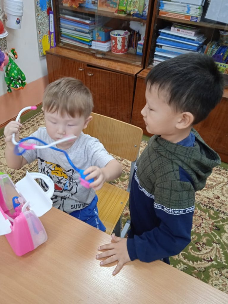 Үлкен балалармен «Дәрігер» мамандығымен ойнадық. Жігіттер пациентке, содан кейін дәрігерге қуана өзгерді. Олар температураны өлшеді, тамақты тексерді, жүрек соғысын тыңдады. Балалардың дәрігер болуға, адамдарды емдеуге деген құштарлығы болды. Рөлдік ойындар мектеп жасына дейінгі балалардың сөйлеу және қарым-қатынас дағдыларын дамыту үшін жақсы.