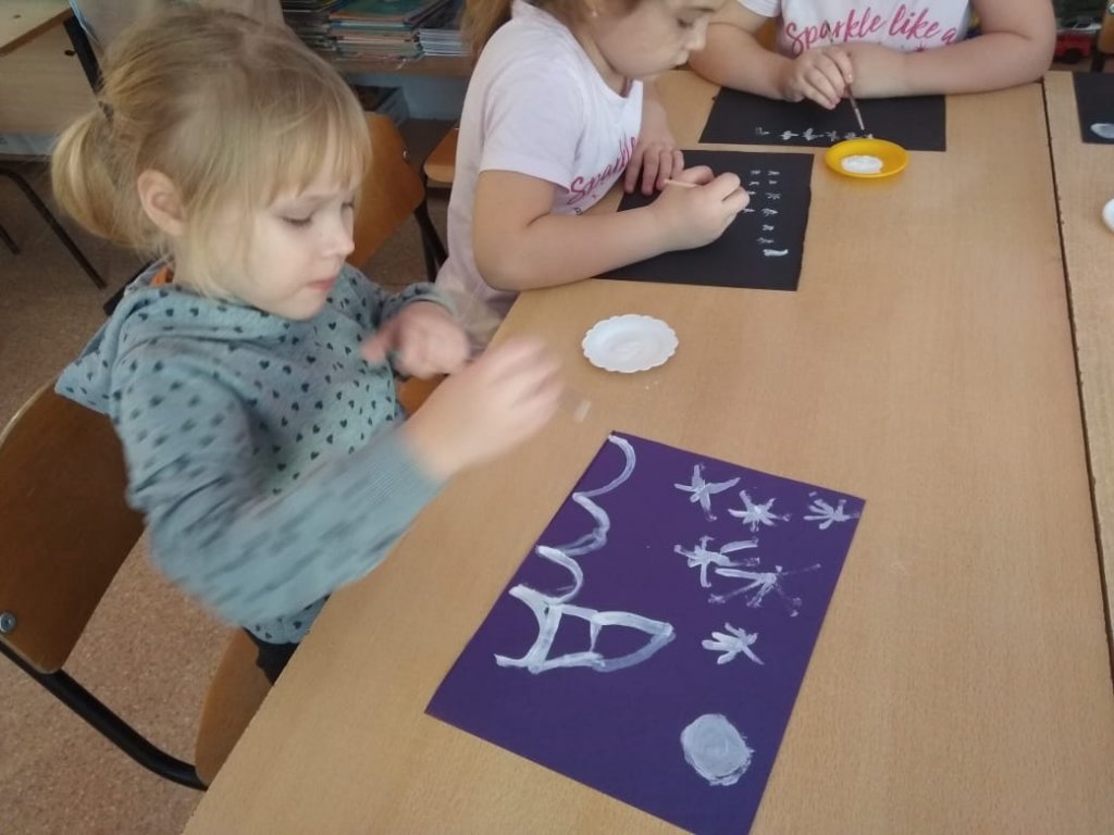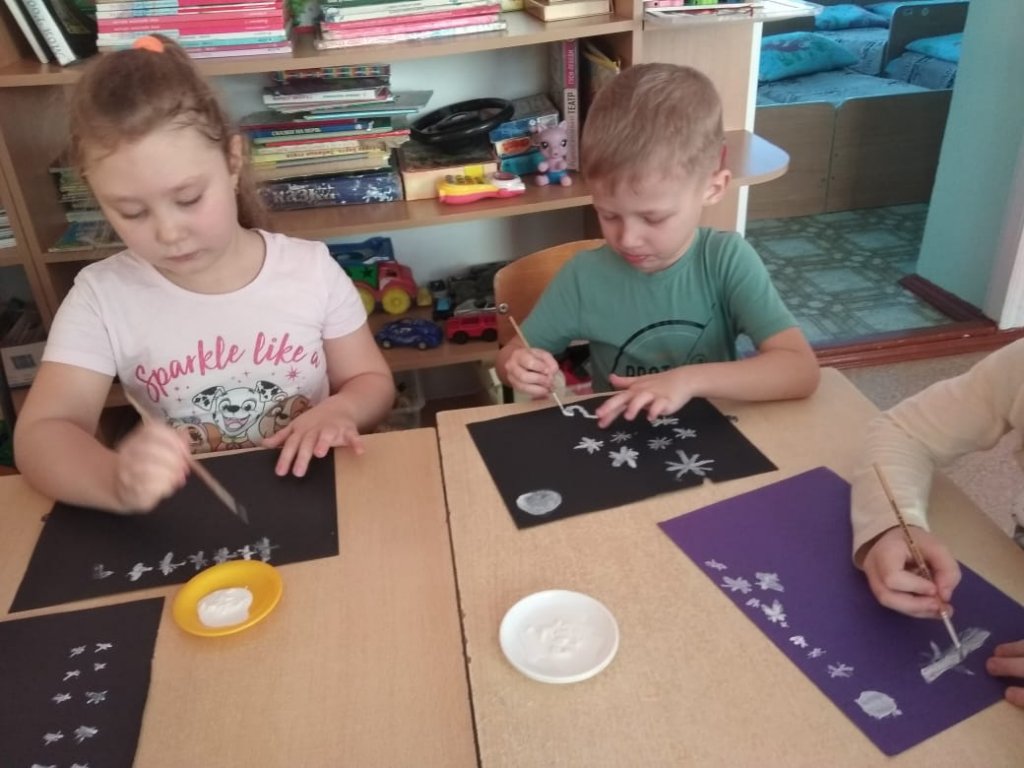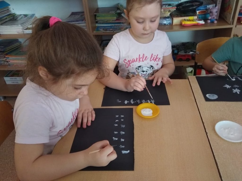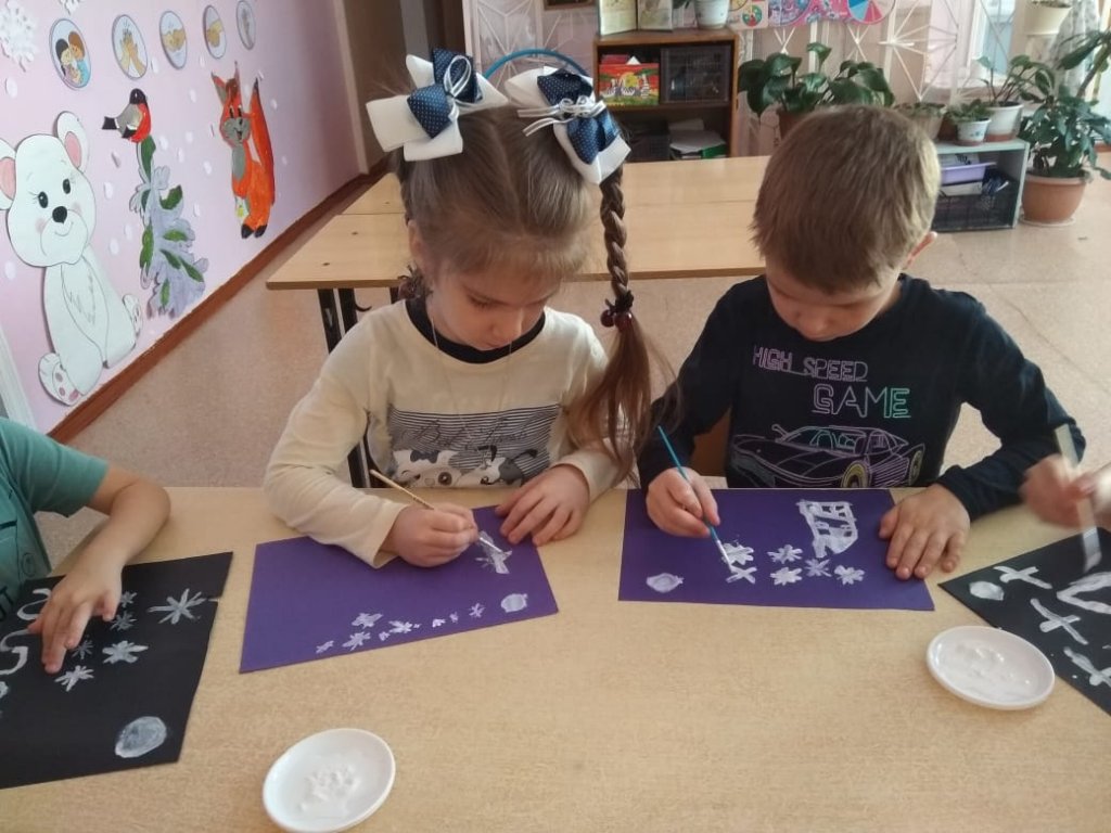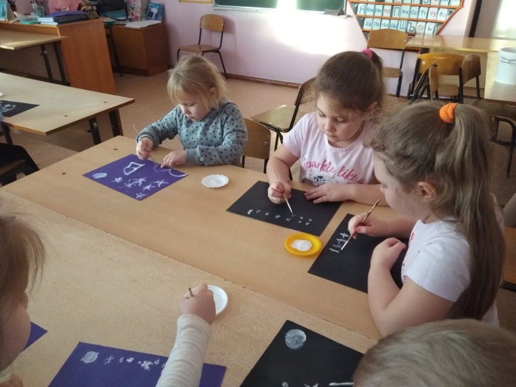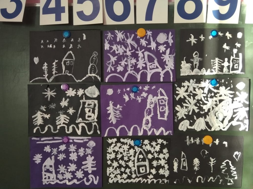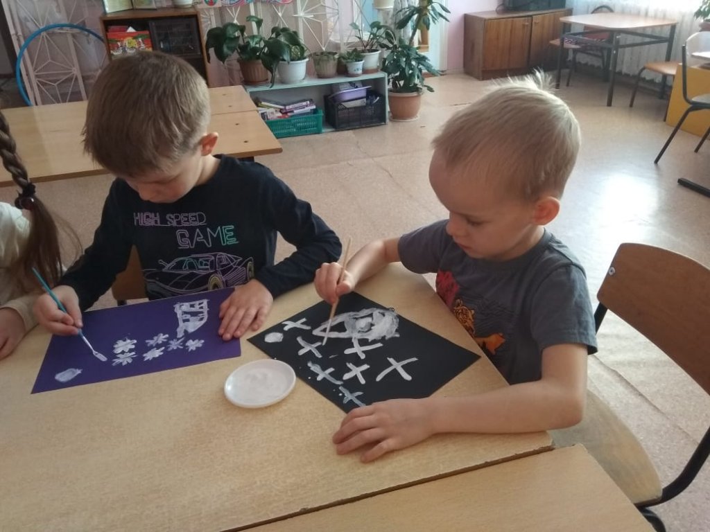 Дайындық тобында гуашьпен «Қыс түні» суреті Ұйымдастырылған іс-шараның мақсаты: суретте тақырыптық композиция құру қабілетін дамыту.