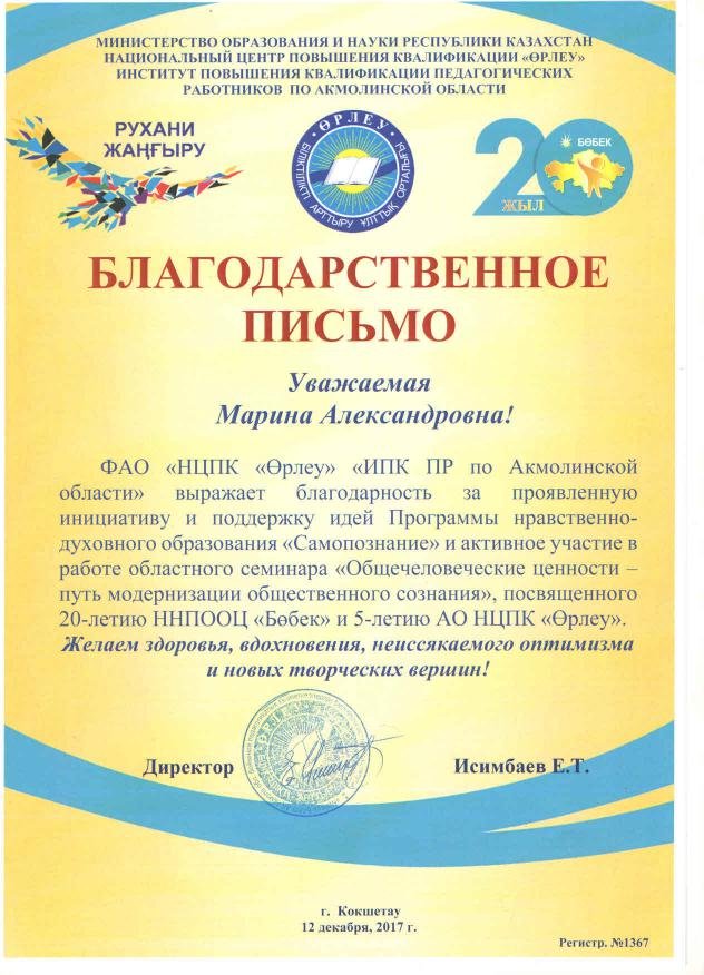 12 декабря 2017 года, педагог высшей категории нашего детского сада Аносова Марина Александровна приняла участие в областном семинаре областного ФАО "Өрлеу" "ИПК ПР по программе нравственно - духовного образования " Самопознание" по теме: "Жалпыадамзаттық құндылықтар - қоғамдық сананы жаңғырту жолы" , " Общечеловеческие ценности - путь модернизации общественного сознания", посвященного 20-летию ННПООЦ "БӨБЕК" и 5 -ти летию АО НЦПК "Өрлеу"на данный семинар был представлен доклад по теме: "Развитие личности дошкольника на занятиях "Самопознания" и видеоматериал по данной теме. По итогам семинара ей было вручено Благодарственное письмо ФАО "Өрлеу" "ИПК ПР за проявленную инициативу и поддержку идей программы нравственно - духовного образования " Самопознание" и сертификат участника семинара.