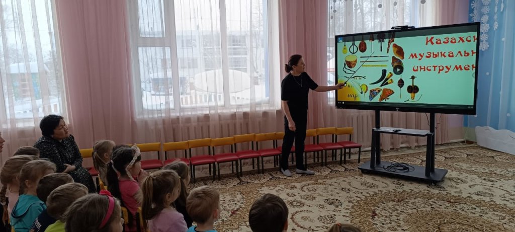 Мектеп жасына дейінгі балаларды қазақ музыка мәдениетімен таныстыру жұмысы ұлттық музыкалық аспаптардың пайда болу тарихымен танысудан басталады. Осы мақсатта музыкалық кабинетте «Қазақтың музыкалық аспаптары» тақырыбында әңгіме жүргізіліп, бейнебаян көрсетіліп, сенсорлық панель арқылы қазақтың халық аспаптарымен таныстыру жүргізілді.