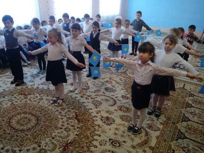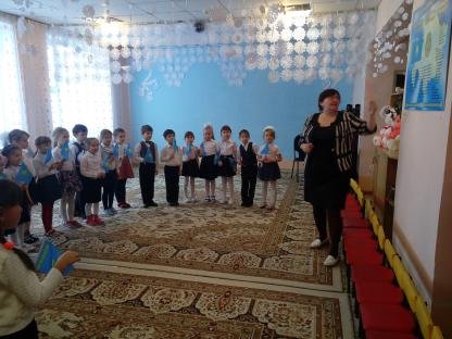 марша детей подготовительной группы песней «Атамекен», дети исполнили Гимн Республики Казахстан, рассказали стихи на государственном языке о символике своей Родины, воспитатель Левен М.А. рассказала детям об истории государственных символов, изображенных на стенде.