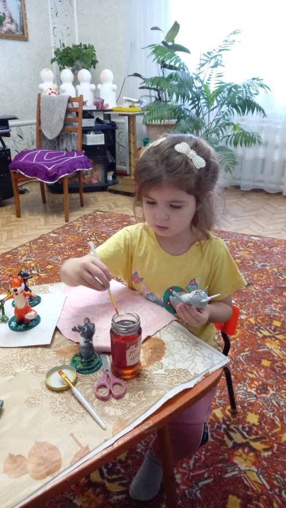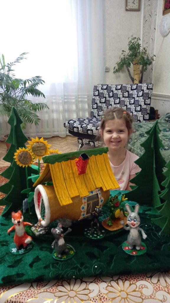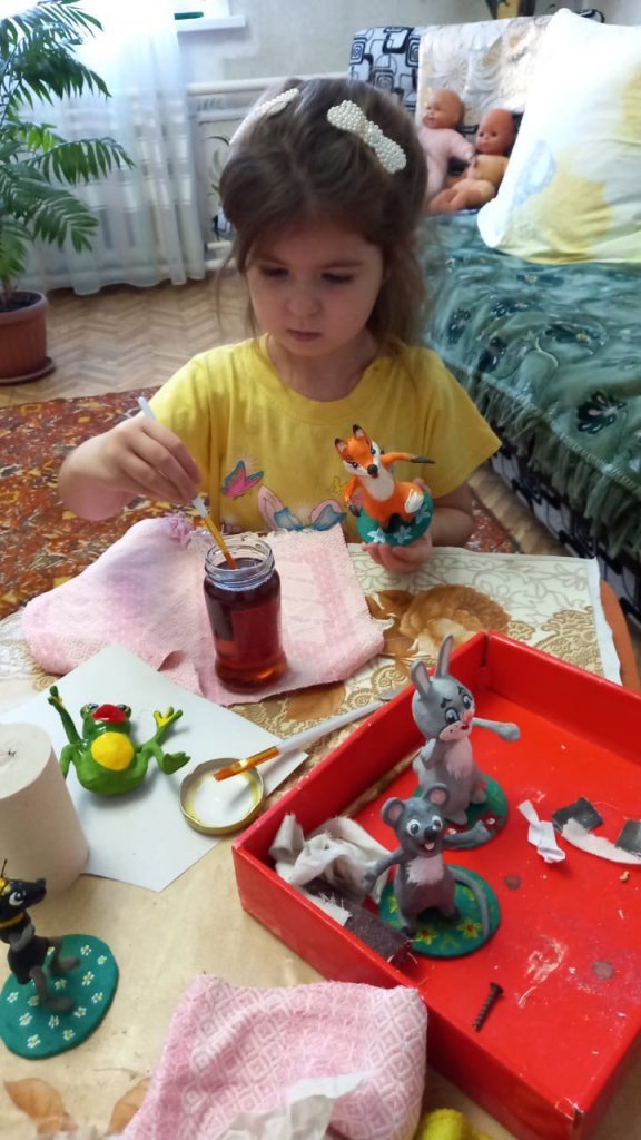 «Құмырада» ертегісі бойынша үстел үсті театрының кейіпкерлерінің фигуралары қағаздан (папье-маше) жасалған, ақ бояумен боялған, гуашьпен боялған. Дизайнды толықтыру үшін маталар, картон, қалдық материал және т.б.